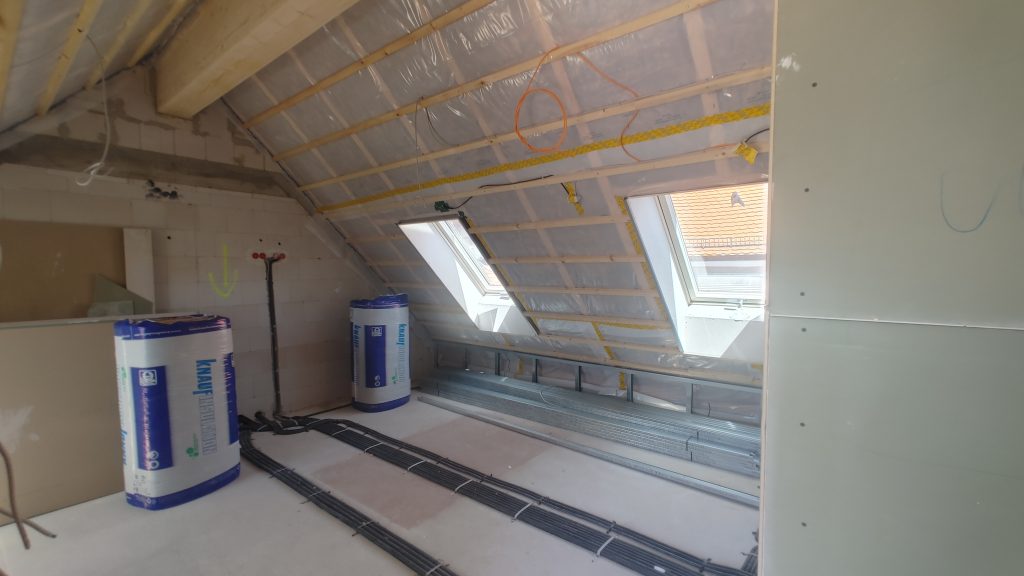 Insbesondere in den Dachgeschosswohnungen waren in den letzten Wochen große Baufortschritte zu beobachten. Hier ist nicht nur die Dämmung des Daches abgeschlossen, auch die Trockenbauwände sind bereits erstellt. So erhält der Betrachter nunmehr ein Gefühl für die finalen Raumgrößen. Die Zimmer vermitteln mit ihren hohen Decken ein wunderbar großzügiges Raumgefühl. Dank der mit dem KfW-Standard 40 verbundenen effizienten Dämmung herrschen hier auch im Sommer – selbst bei starker Sonneneinstrahlung und großer Hitze – angenehme Temperaturen.