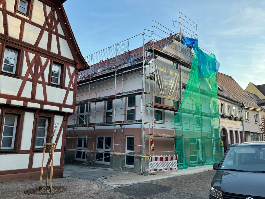 Das Bauvorhaben in Obernburg nähert sich langsam der Zielgeraden. Von außen sofort ersichtlich ist die Tatsache, dass nunmehr der Außenanstrich erfolgt ist. Damit wurde das im vergangenen Dezember von der DWG eG vorgestellte Farbkonzept für das Gebäude umgesetzt. Dieses besteht aus einem hellen Grauton als Grundfarbe, von dem das Erdgeschoss, die Fensterlaibungen in den oberen Geschossen und einige andere Bereiche in einer zum historischen Kontext passenden Farbe abgesetzt sind: Sie sind im Farbton des für die Region typischen Roten Mainsandsteins gestrichen. So greift der Neubau die Farbgebung des Vorgängergebäudes auf dem Grundstück, des ehemaligen Gasthauses zum Löwen, auf und fügt sich nahtlos in die Altstadtumgebung ein.