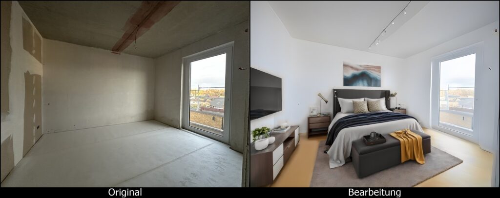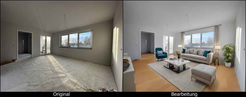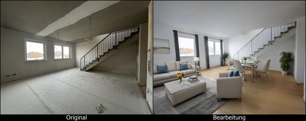 Das Aufkommen generativer künstlicher Intelligenz hat die Situation in der Makler- und Wohnungsbranche entscheidend verändert: Dank moderner KI-basierter Bildbearbeitungsprogramme ist es heute nicht mehr zwingend notwendig, derartige externe Dienste in Anspruch zu nehmen. Anbieter wie die DWG eG können vielmehr selbst tätig werden und zu einem Bruchteil der Kosten eigenhändig bestehendes Bildmaterial bearbeiten beziehungsweise Visualisierungen erstellen. Auch wenn die Ergebnisse noch nicht dem Niveau professionell erstellter Grafiken entsprechen, ist die Qualität aus Sicht der Genossenschaft aus Großwallstadt für viele Anwendungsfälle durchaus ausreichend.
