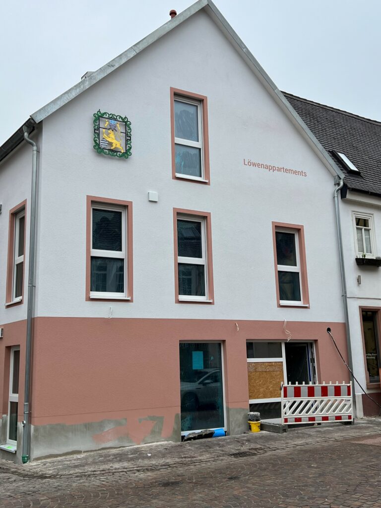 Mit den „Löwenappartements“ entstehen mitten in der Obernburger Altstadt ja 17 möblierte Wohnungen für Bewohner, die Wohnraum zur kurz- und mittelfristigen Miete suchen. Das Gebäude, das somit zum „Wohnen auf Zeit“-Angebot der Genossenschaft aus Großwallstadt gehört, hat seit dem letzten Bericht im Februar einen entscheidenden Entwicklungsschritt vollzogen: Nicht nur ist die Außenfassade so gut wie fertiggestellt, auch das Gerüst wurde abgebaut.